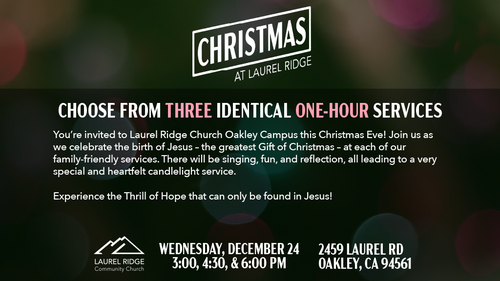 You’re invited to Laurel Ridge Church Oakley Campus this Christmas! Join us as we celebrate the birth of Jesus – the greatest Gift of Christmas – at each of our family-friendly services. Each identical service will be one hour in length. There will be singing, fun, and reflection leading to a very special, heartfelt candlelight service. Free childcare provided as an option for ages 2 and under. Children older than 2 years are welcome to join the kids when they sing on stage and then sit together with their family for the service.